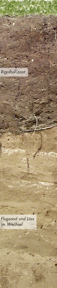 Fruchtbarer, tiefgründiger, schluffiger Sandboden, nährstoffreich, kalkhaltig, gute Speicherfähigkeit für pflanzenverfügbares Bodenwasser, gute Durchlüftung, gute Durchwurzelbarkeit, mäßig bis gute Erwärmbarkeit, hohes Wuchspontenzial.